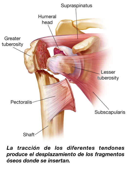 Cuando se produce una fractura de húmero proximal, los diferentes fragmentos óseos se van a ver influenciados por la tracción de los diferentes tendones que se insertan en cada uno de ellos, favoreciendo su desplazamiento. Así, en el troquíter, se inserta el tendón del supraespinoso e infraespinoso; en el troquín, el subescapular y en la diáfisis humeral, el pectoral mayor.