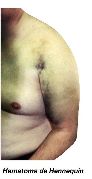Los síntomas fundamentales son el dolor e impotencia funcional, junto con edema y hematoma. El clásico hematoma de Hennequin aparece a las 48h en la cara medial del brazo y sobre el tórax, lo que a veces asusta al paciente porque cree que tiene una lesión de la parrilla costal asociada.