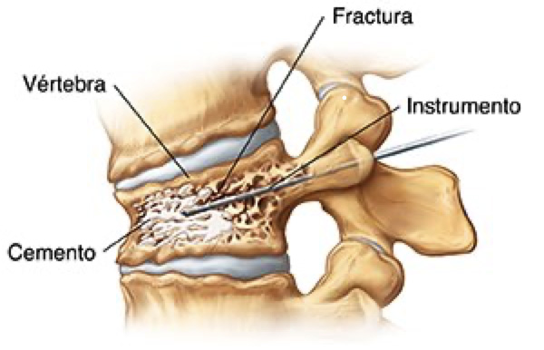 • Técnicas percutáneas (Vertebroplastia o Cifoplastia): consiste en la introducción de cemento en la vértebra fracturada inflando  previamente un balón o no, a través de dos incisiones de 2-3mm.