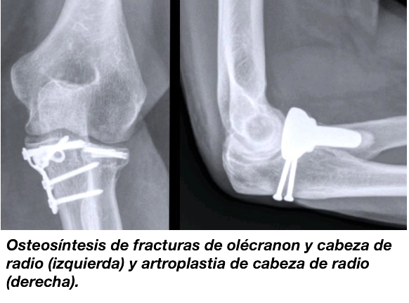 Aquellas lesiones de partes blandas con afectación ósea, fundamentalmente fractura de la cabeza de radio, coronoides y olécranon. Los pacientes que presentan fracturas asociadas precisan habitualmente una intervención quirúrgica, sobre todo cuando se vea afectada la cabeza de radio y coronoides, lo que se denomina “triada terrible de codo”. Las fracturas asociadas deberán sintetizarse y, en caso de que no sea posible como en una fractura continua de radio, colocarse una prótesis para mantener la estabilidad del codo. Si tras la síntesis de las fracturas el codo continúa inestable, se deberá proceder a la sutura de los ligamentos colaterales. Los resultados de las fracturas luxaciones son peores que en los casos de luxaciones simples, presentando reluxaciones hasta en el 17% de los pacientes, rigidez e inestabilidad.