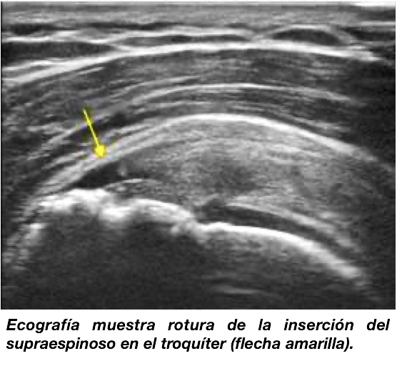 - Como hemos dicho, existen las ROTURAS AGUDAS sobre tendón sano o degenerado, que cursan con incapacidad funcional completa inmediata, fundamentalmente de la abducción del brazo hasta los 90º ya que afecta principalmente al supraespinoso. En el caso de un tendón sano, acontece tras un traumatismo intenso: tracción brusca o caída; en el caso de un tendón previamente degenerado, puede aparecer con un esfuerzo mínimo como una elevación forzada o coger un peso: meter una bolsa de basura en un contenedor o lanzar una pelota.