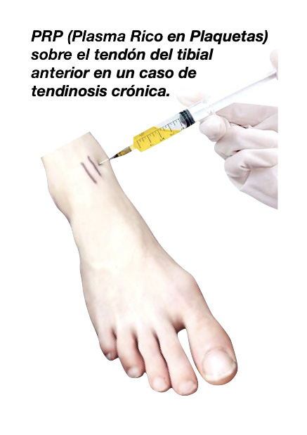 - Terapias Biológicas de Medicina Regenerativa: basadas en el concepto de “autocuración”, la infiltración de plasma rico en plaquetas (PRP) sobre una lesión crónica (tendinosis) del tibial anterior.